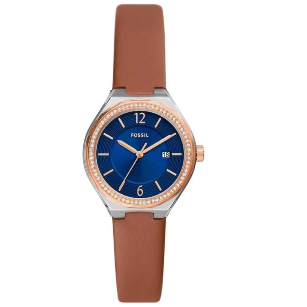 This 30mm Eevie features a blue cd finish, sunray dial, three-hand date movement and brown leather bracelet.
